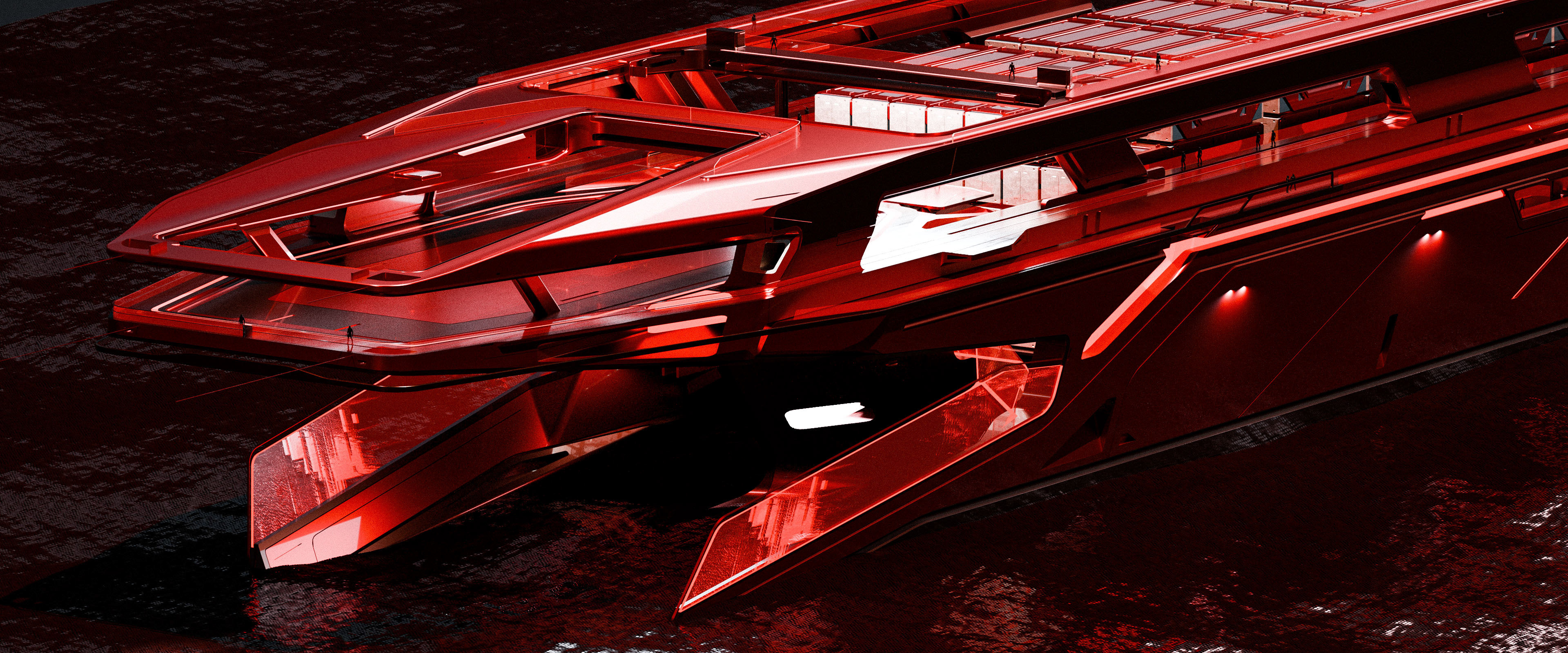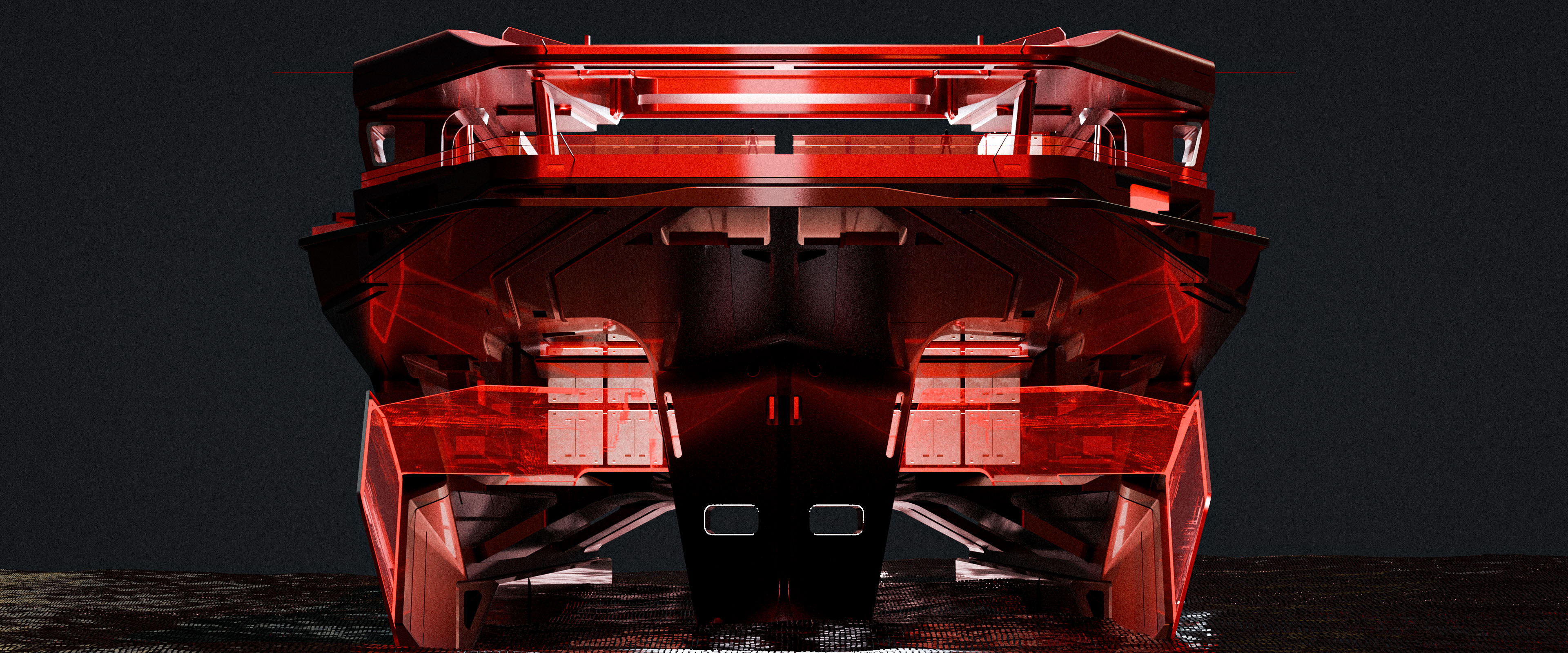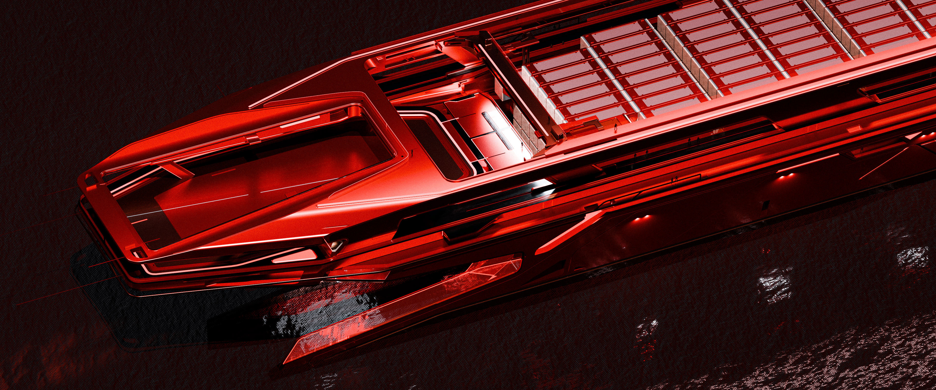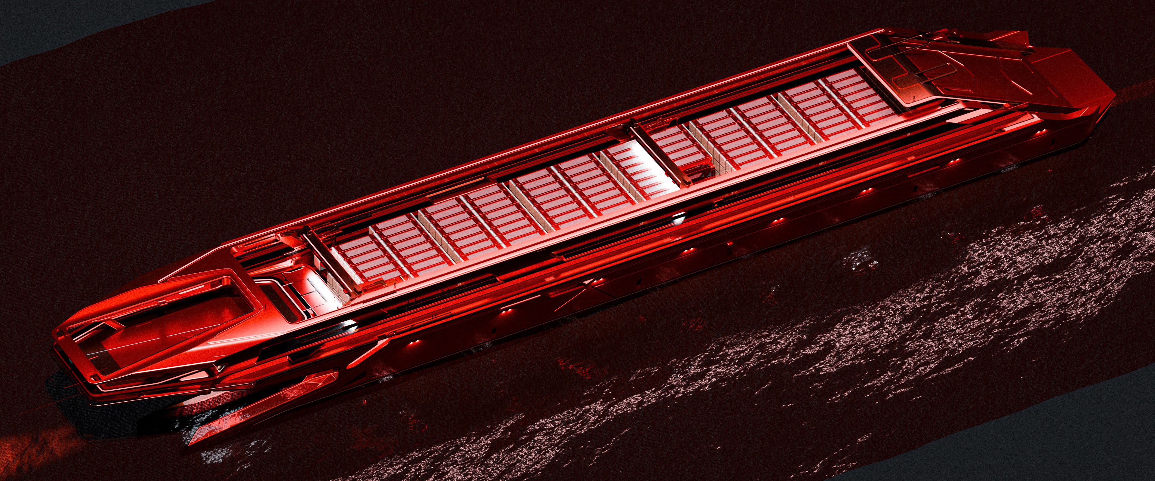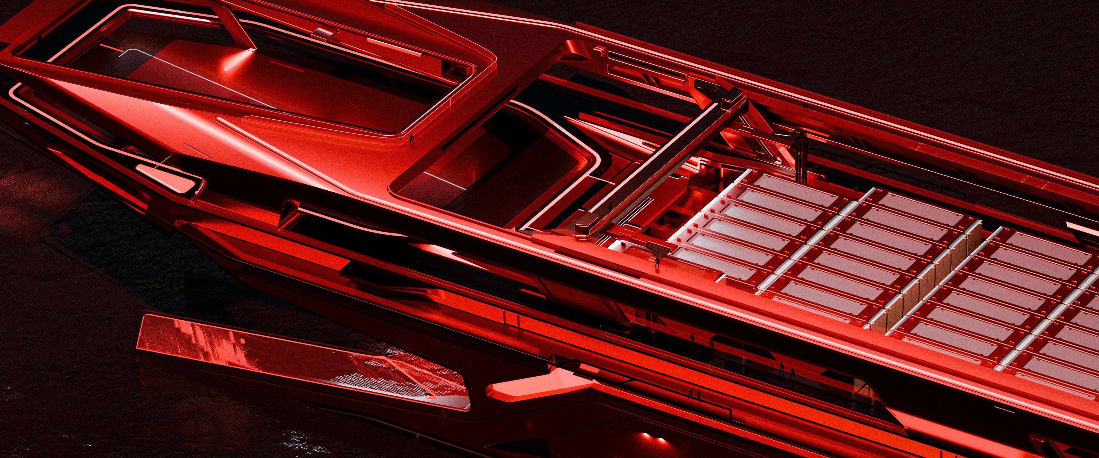 This design represents a large-scale cargo ship within the Dillinger vehicle family, crafted for the film Tron: Ares. The brief from Darren called for a massive cargo vessel capable of efficiently receiving load units from the Dillinger solar sailer situated directly above.